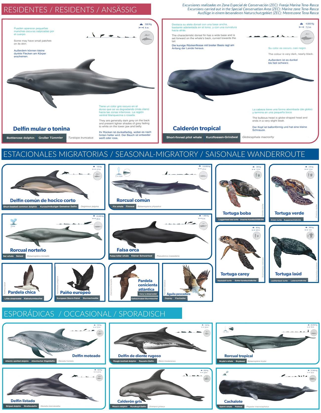 - Todos estos elementos contribuyen a que estas aguas sean sumamente ricas en materia orgánica, peces y, especialmente, en calamares y otros cefalópodos. Además, es posible encontrar ejemplares de calamar gigante, que constituye el manjar favorito del cachalote (Physeter macrocephalus). La abundancia de alimento, junto con los factores mencionados anteriormente, propicia que las ballenas piloto o calderón tropical (Globicephala macrorhynchus) y el delfín mular (Tursiops truncatus) sean especies residentes durante todo el año y por muchos años en nuestras aguas. Aparte de estas dos especies, que son frecuentes en estas aguas, también es factible avistar con cierta regularidad.
